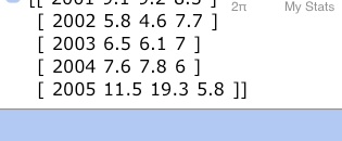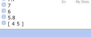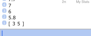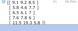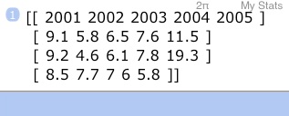 Now, we had to go through a couple of hoops to accomplish our goal. Had we been happy to just append our new data it would have been easier: we would have entered the data as a vector, transposed the statistics matrix, saved it, used ∑+ to add our new vector, recalled the matrix, transposed and saved it.