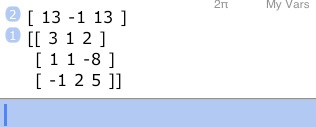 Basic operators (“+”, “-”, “*”, “/”, ) work with matrices, or matrices in combination with vectors. In addition, there’s a number of specialized functions, found in the Array menu, for tasks like transposing, calculation of norms, trace, rank, determinant.